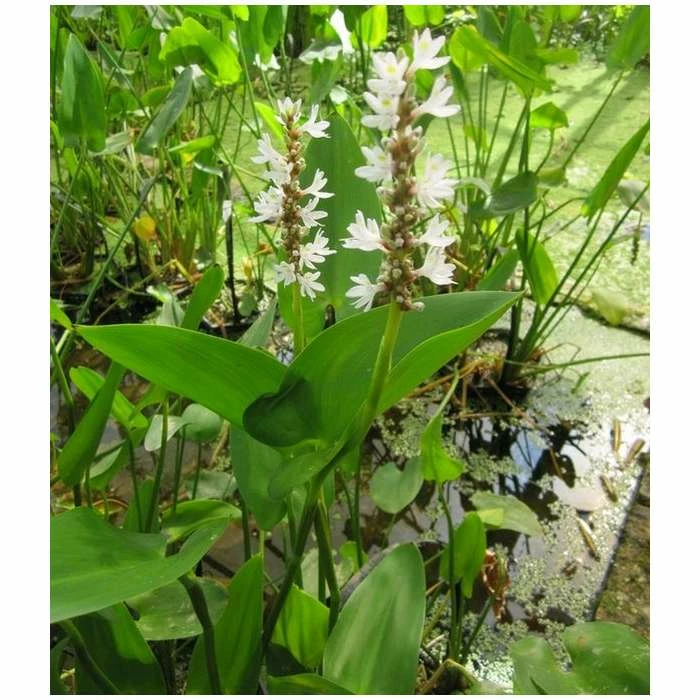 The White Pickerel Weed is a marginal aquatic grass with white flowers blooming in summer amidst bright green heart shaped leaves on dense, erect spikes.